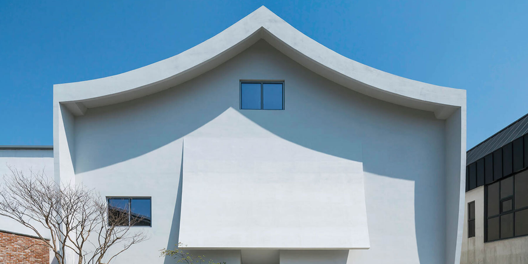 the project sits like a ring placed over the terrain, with its funnel-like roof forming a shaded perimeter walkway and an introverted core.