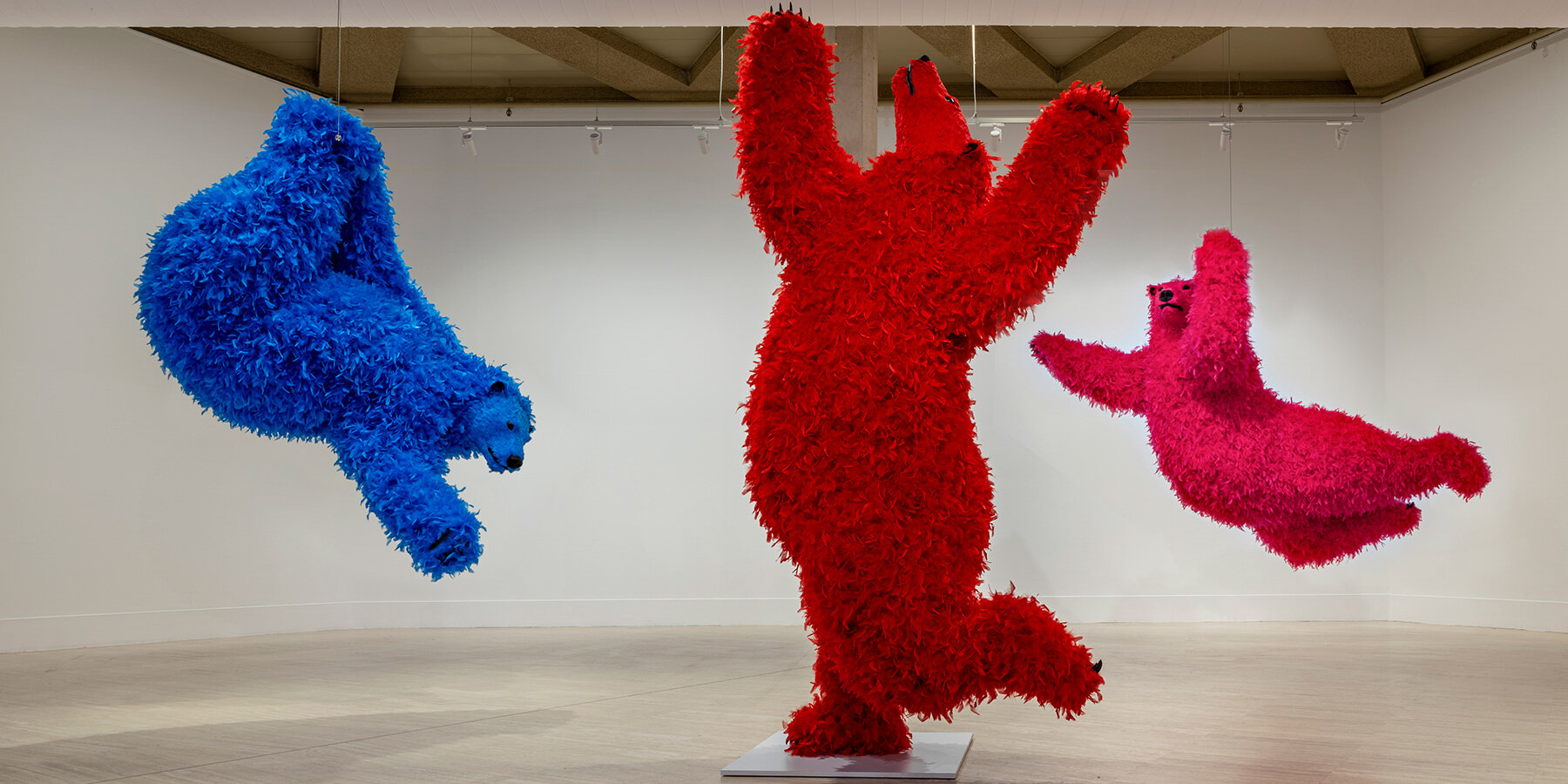 Installation view at the Art Gallery of Western Australia (AGWA), Perth, 2025 — Paola Pivi: Art Hunter (2025), polyurethane foam, plastic, trapeze, and feathers, 210 × 148 × 94 cm; This is my life (2025), polyurethane foam, plastic, feathers, and metal base, 270 × 138 × 97 cm; Art makes you high (2025), polyurethane foam, plastic, and feathers, 189 × 265 × 145 cm. Courtesy of the artist and Perrotin. © Paola Pivi | image © Ela Bialkowska, OKNO Studio.