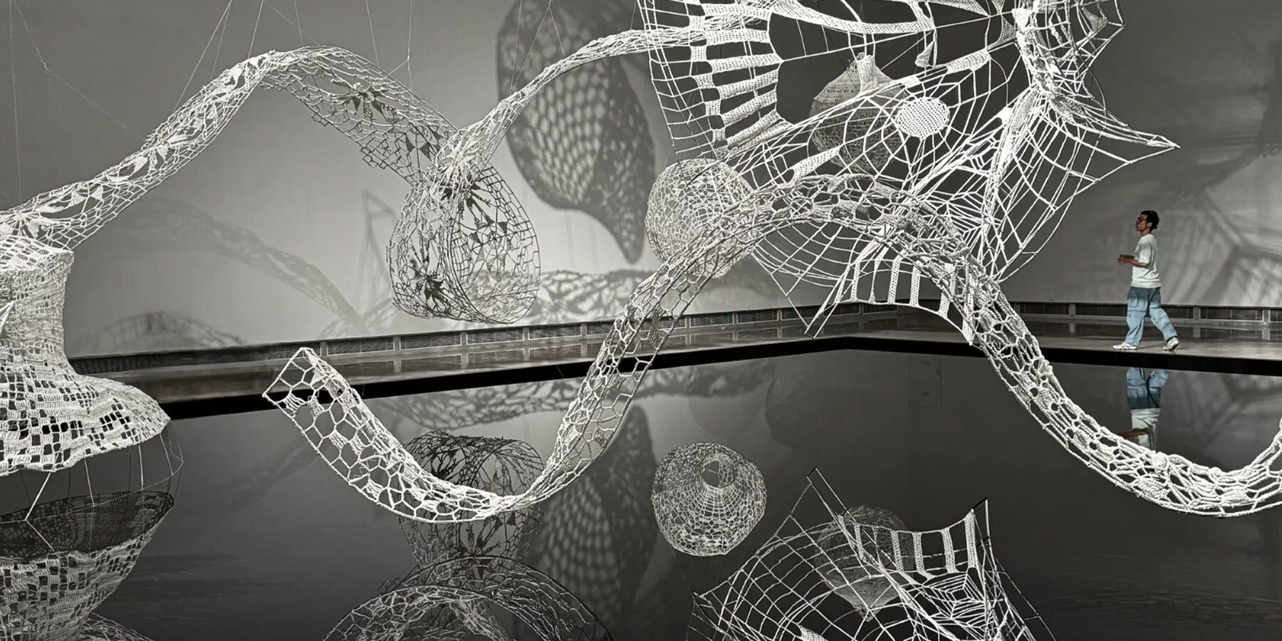 the works are staged within mangroves, tidal waterways, and open sky, allowing technology and environment to operate as a single system.