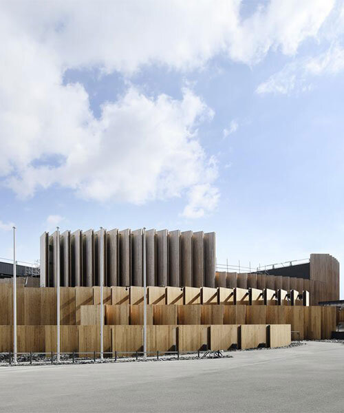the project sits like a ring placed over the terrain, with its funnel-like roof forming a shaded perimeter walkway and an introverted core.