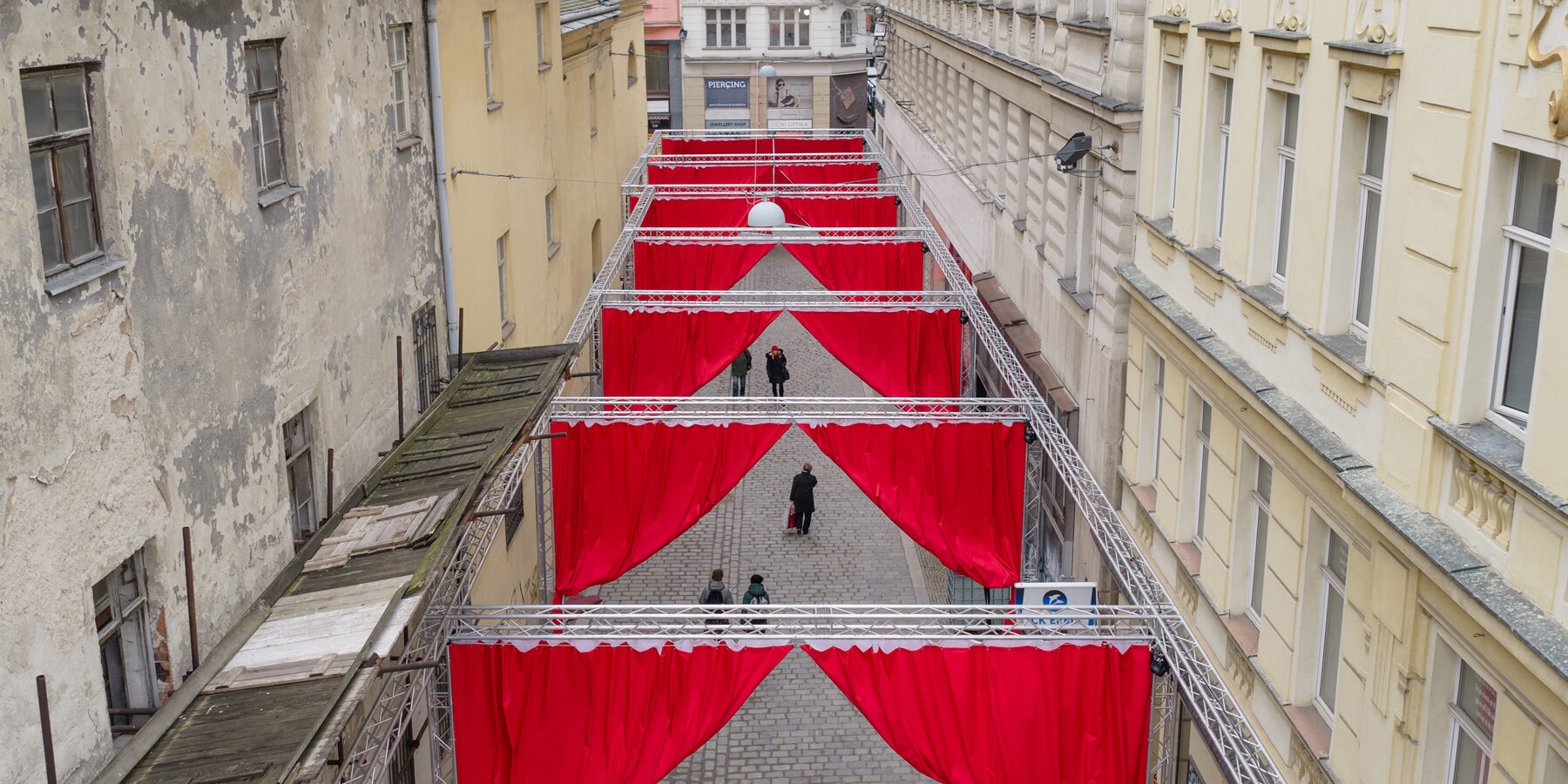 red and white curtains transform czech historic center’s pathways into christmas installation