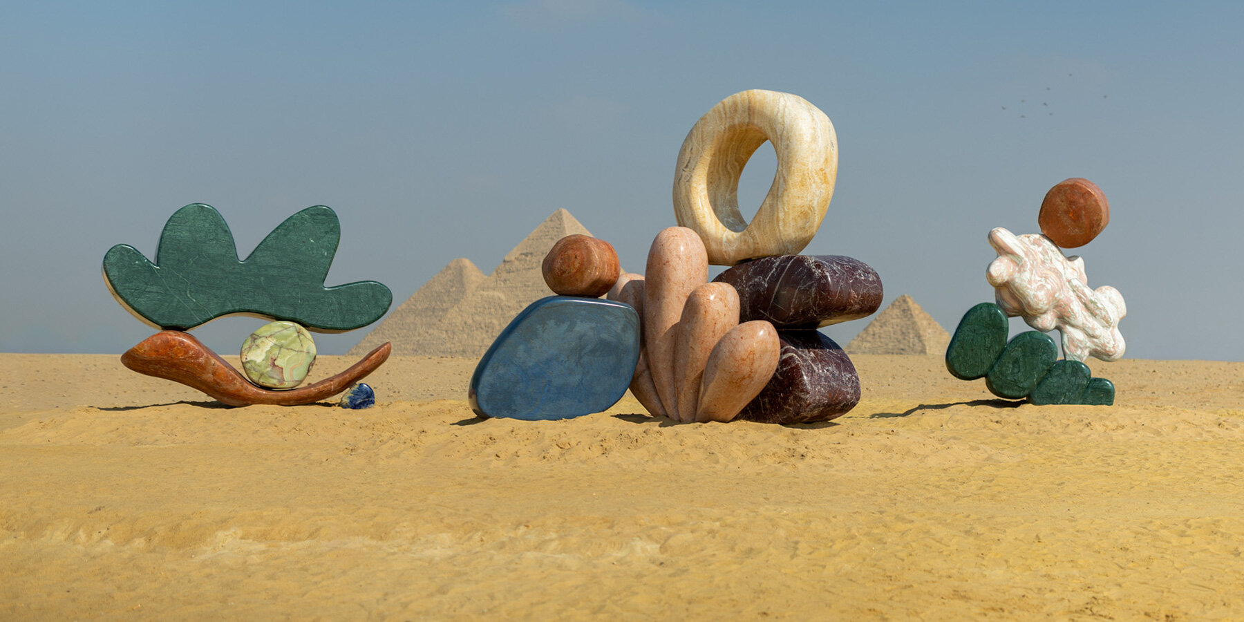 a reddish-brown lower curve grounds the piece in the sand