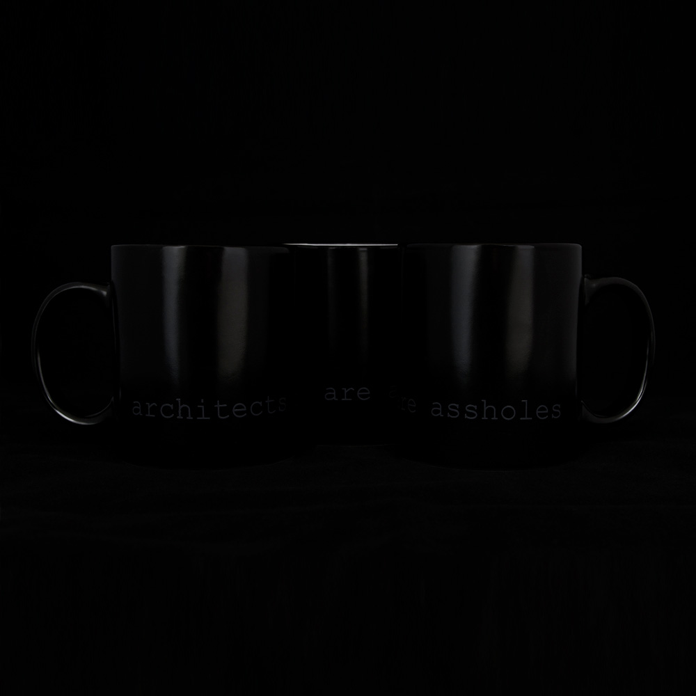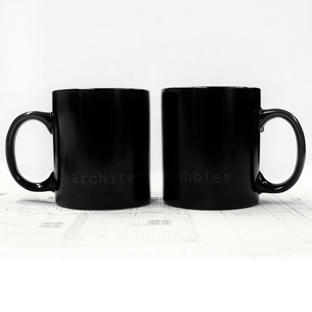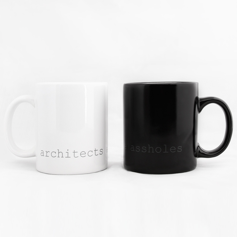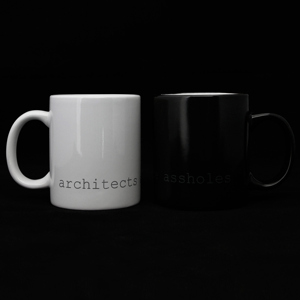 The minimal 11oz mug is a standard classic design that architects and designers can appreciate. Printed using photography’s quintessential 18% grey and courier new font that hearkens back to the mid century modern typewriter, the architects are assholes mug is a cheeky nod to architecture’s provocative personalities. The mugs are available in bright white and matte black with white interior.