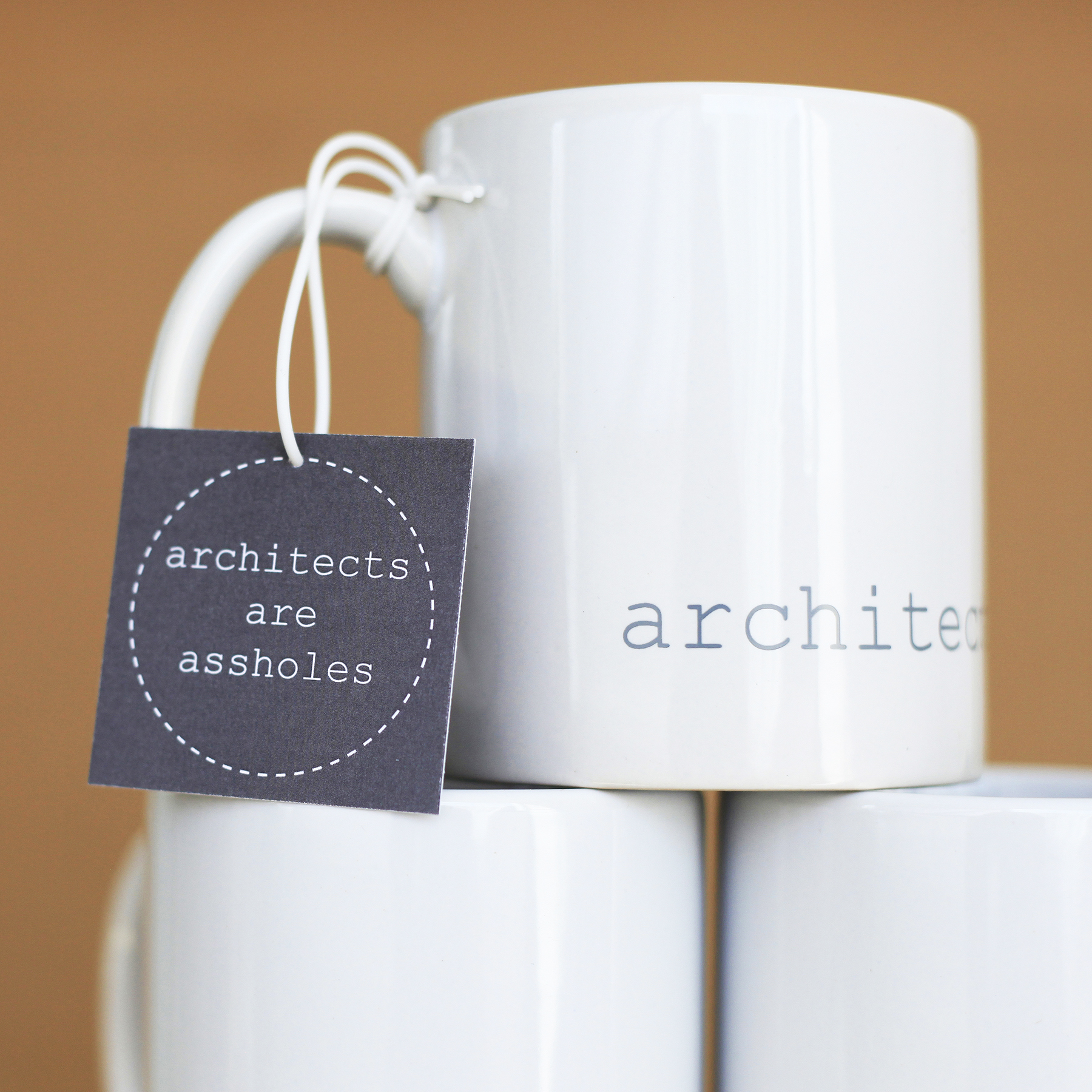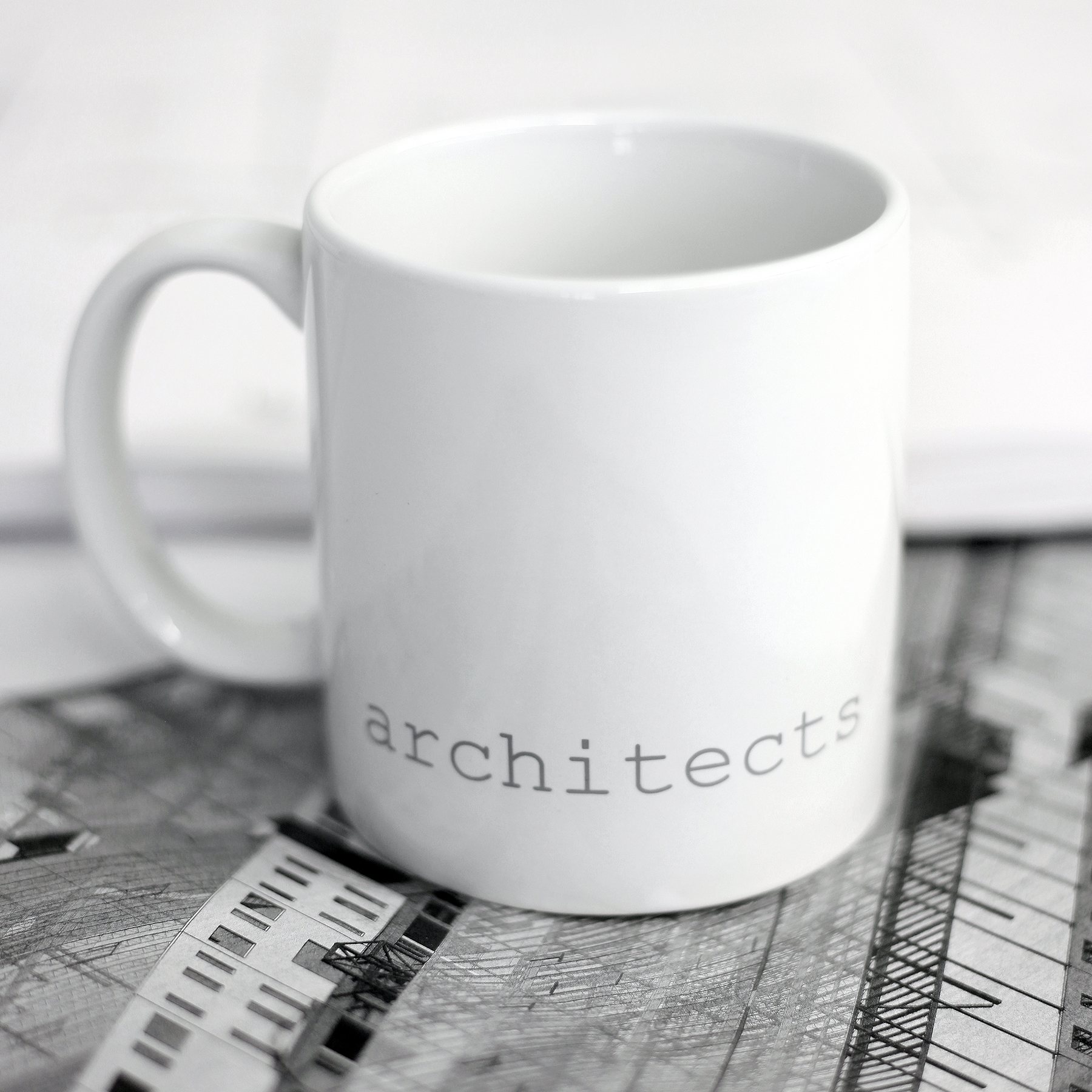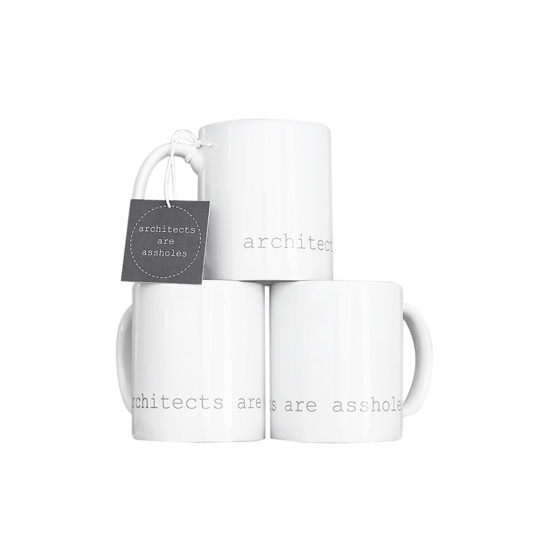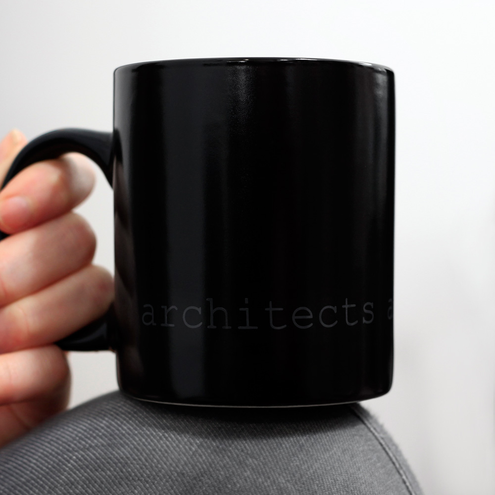 The minimal 11oz mug is a standard classic design that architects and designers can appreciate. Printed using photography’s quintessential 18% grey and courier new font that hearkens back to the mid century modern typewriter, the architects are assholes mug is a cheeky nod to architecture’s provocative personalities. The mugs are available in bright white and matte black with white interior.