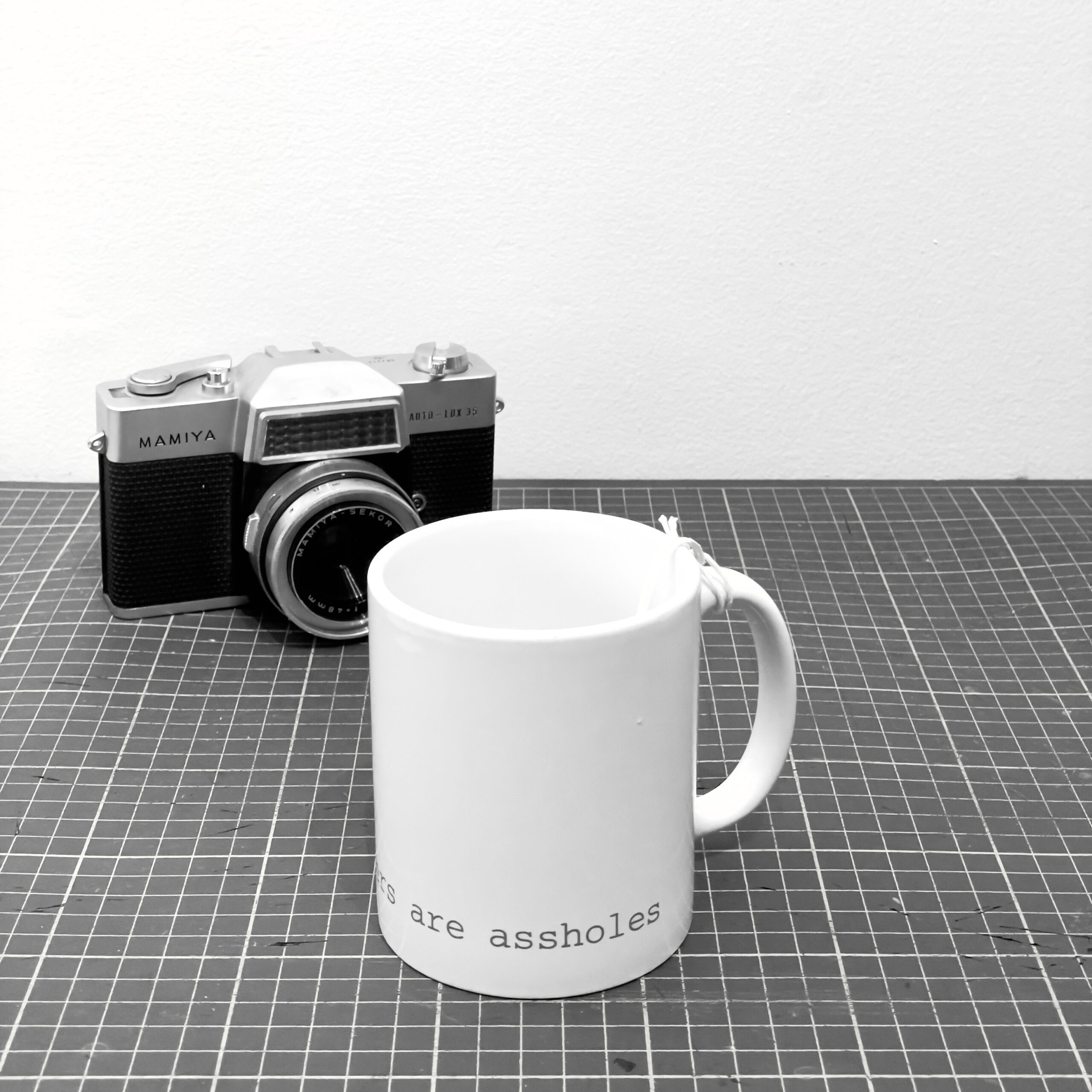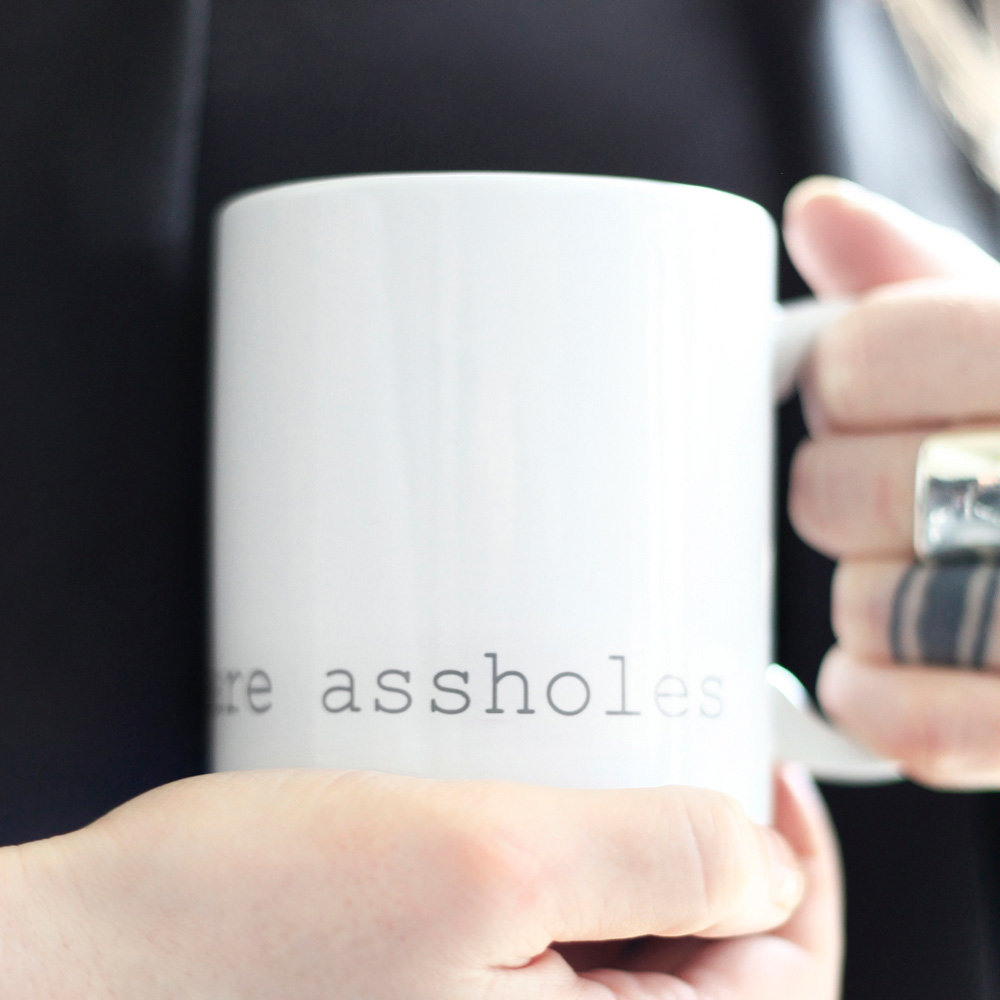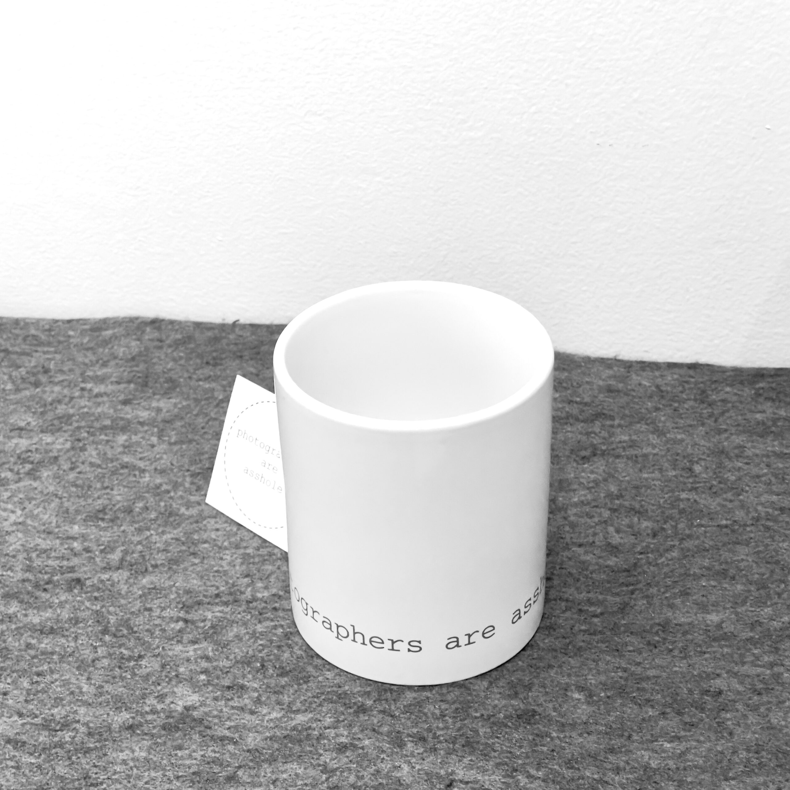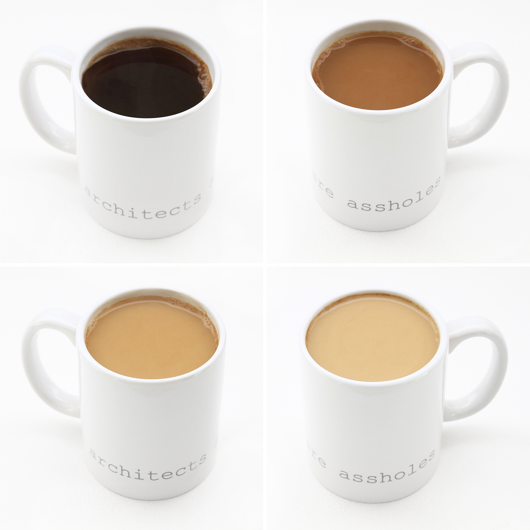 The minimal 11oz mug is a standard classic design that architects and designers can appreciate. Printed using photography’s quintessential 18% grey and courier new font that hearkens back to the mid century modern typewriter, the architects are assholes mug is a cheeky nod to architecture’s provocative personalities. The mugs are available in bright white and matte black with white interior.