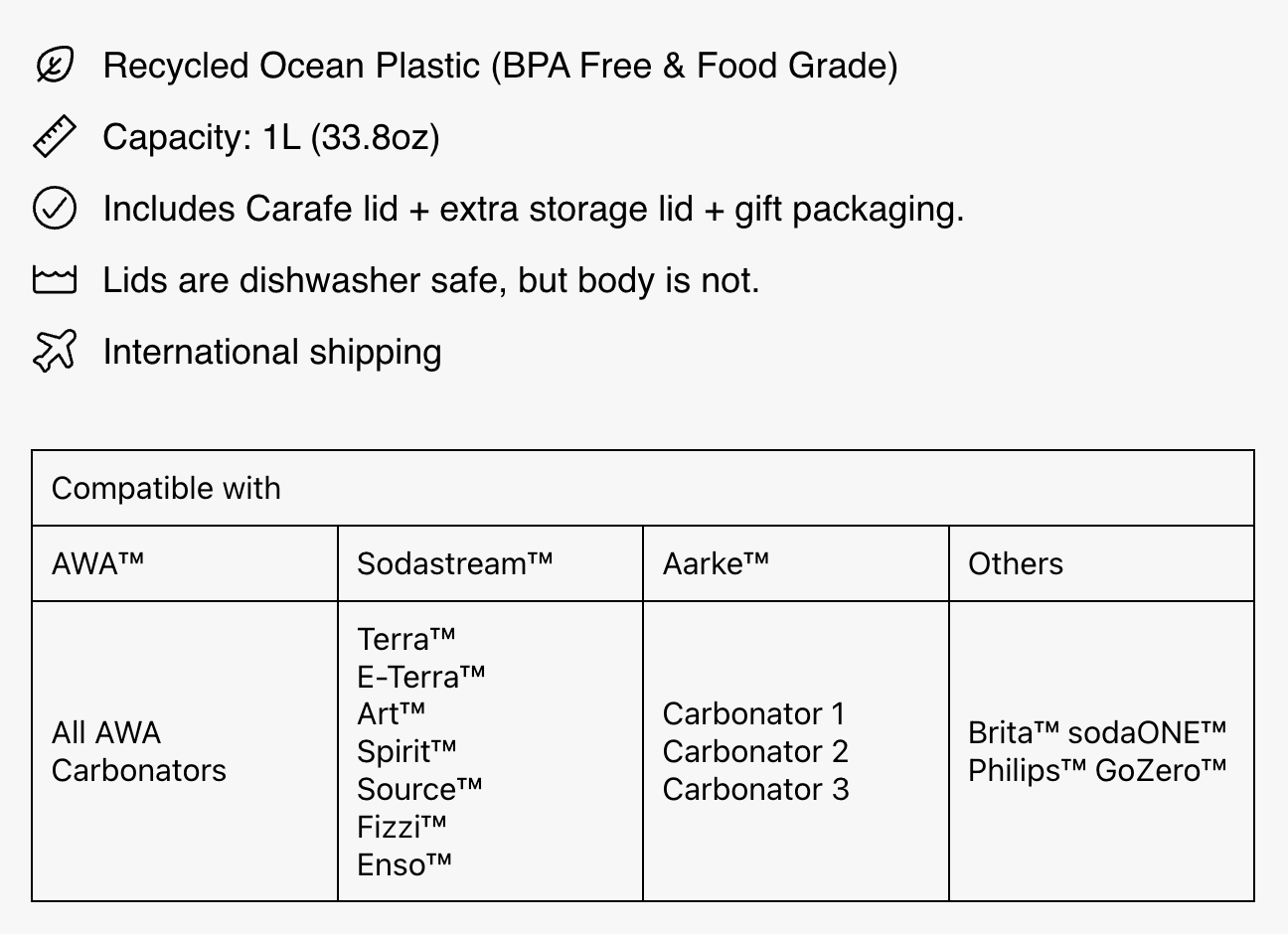 The Carafe can be fully disassembled for targeted recycling and fits seamlessly with AWA Carbonators and most popular sparkling water machines, making it an eco-conscious and practical addition to your daily routine.