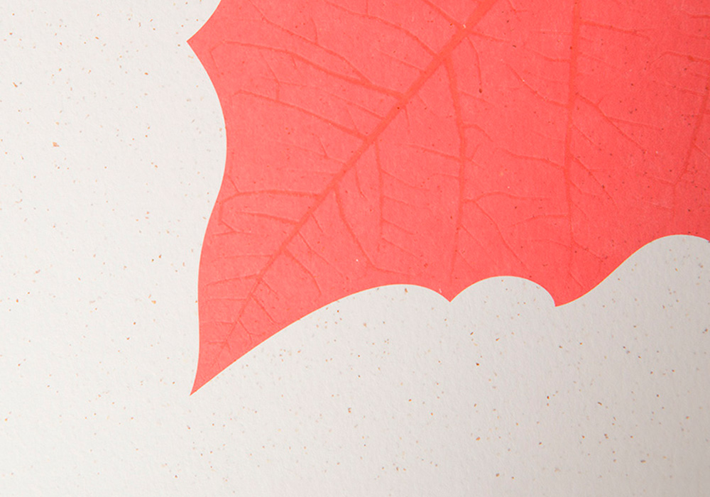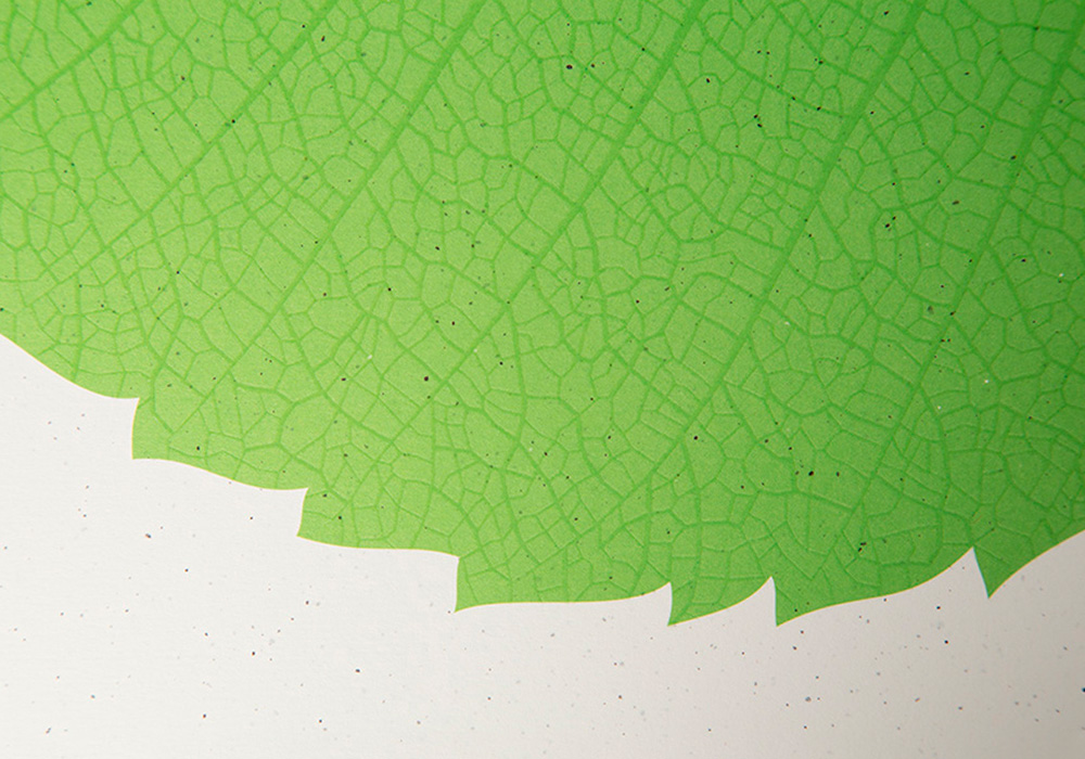 With environmentally-friendly paper made with recycled green tea, seaweed, and brewer’s grains, the texture of leaves is elaborately expressed.