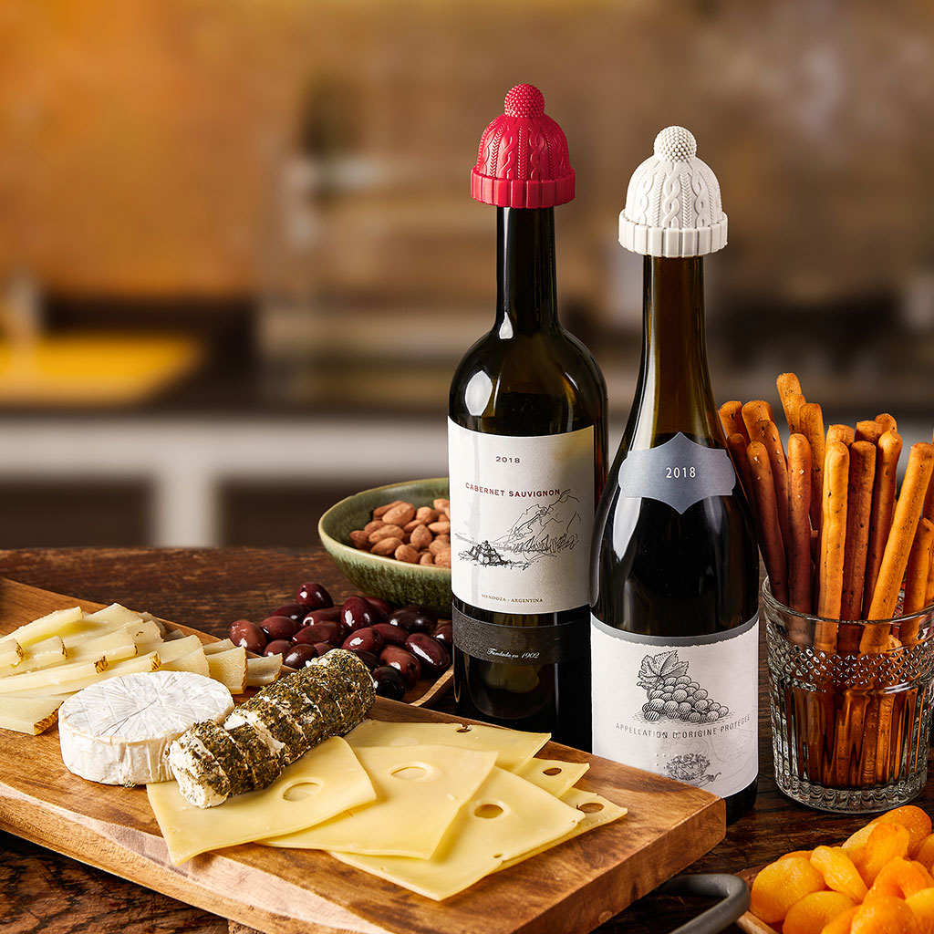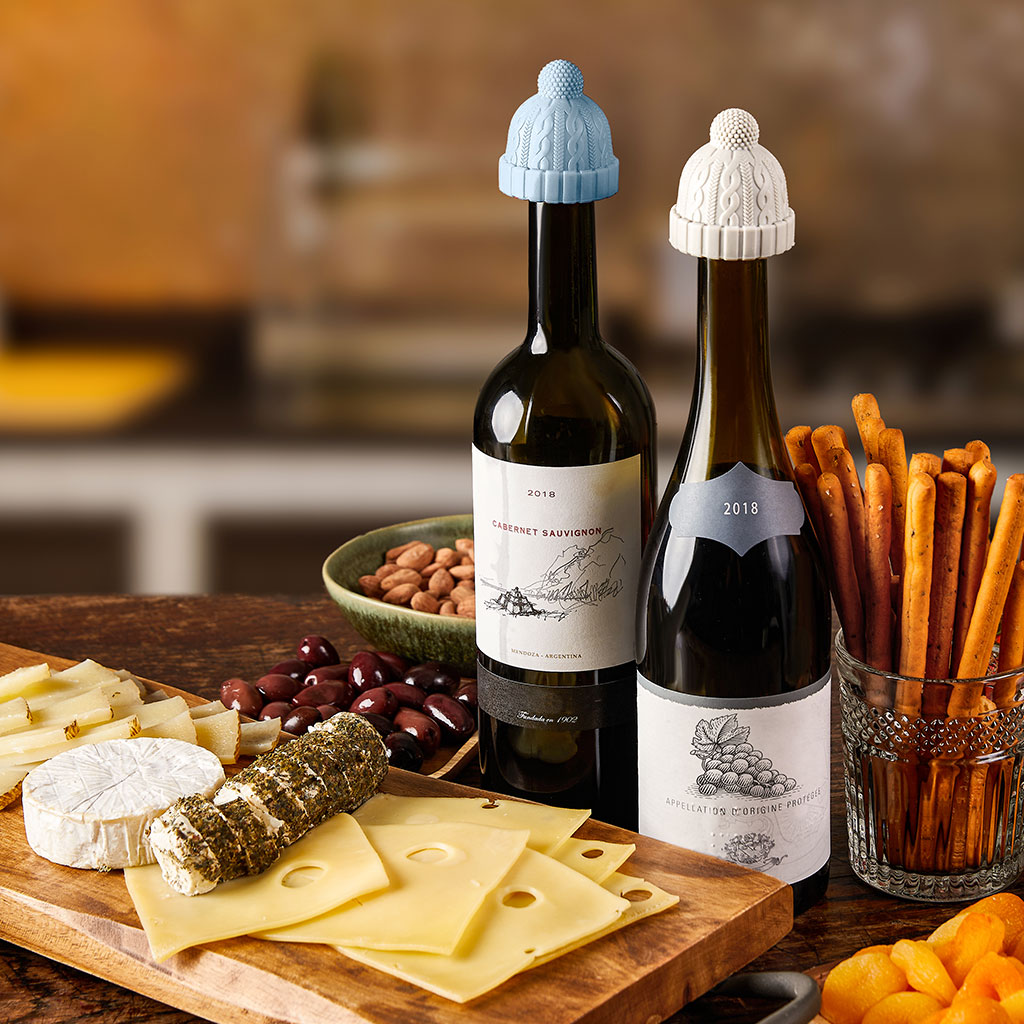 Winter hat bottle stoppers made of silicone to plug open wine bottles and add some fun to tomorrow’s wine.