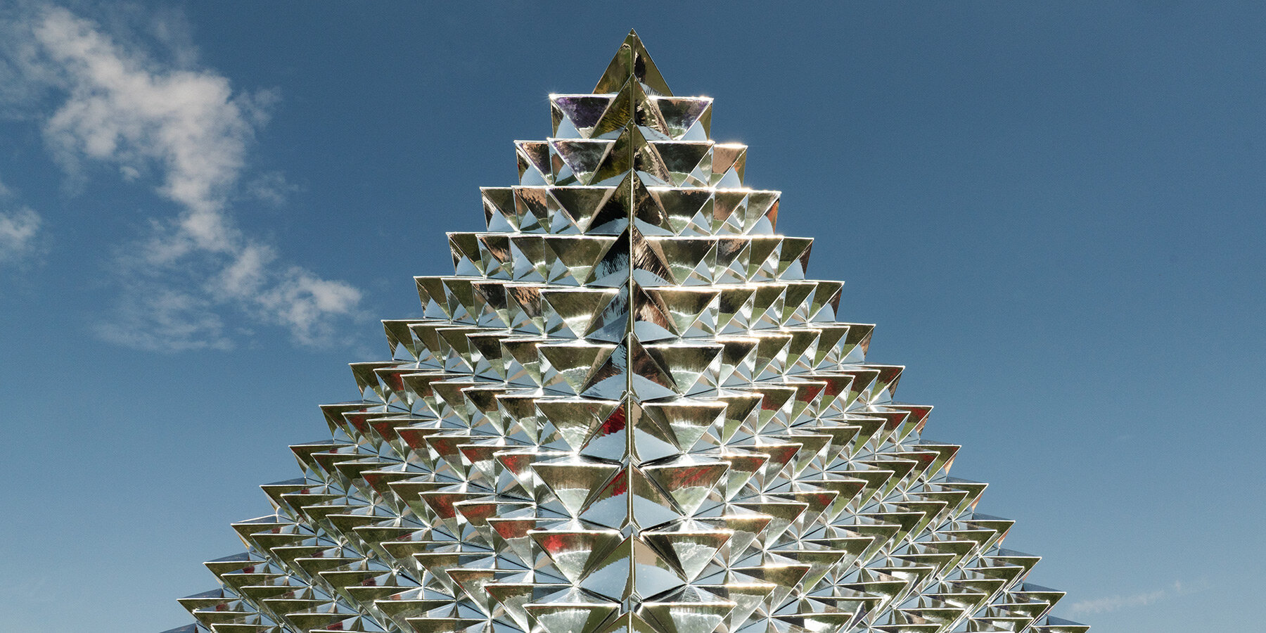 Ecotonos appears as a fractured prism in the center of the park, a sculptural threshold that divides the sensory regimes of the city and the natural environment. The installation borrows its name from ‘ecotones,’ the transition zones between ecosystems where diversity concentrates. On one side, its diamond-like, reflective surface dematerializes the skyline into ghostly mirages; on the other, it opens into a soft, honeycomb-like interior carved with cavities that recall a beehive. This geometry absorbs and modulates sound, dampening mechanical noise and amplifying subtle natural frequencies, from bees’ vibrations to the rustling of leaves.