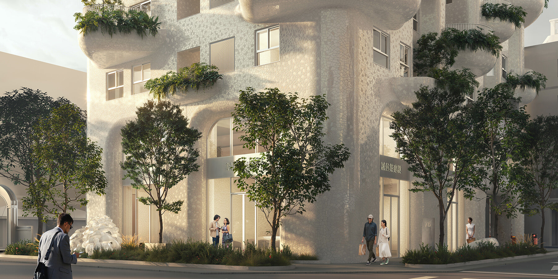 the project sits like a ring placed over the terrain, with its funnel-like roof forming a shaded perimeter walkway and an introverted core.