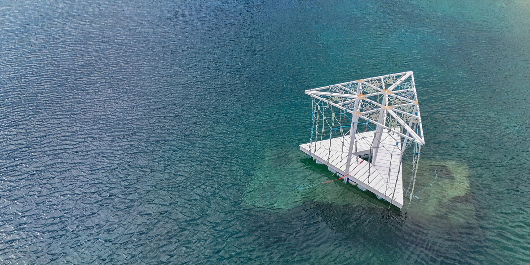 the project sits like a ring placed over the terrain, with its funnel-like roof forming a shaded perimeter walkway and an introverted core.