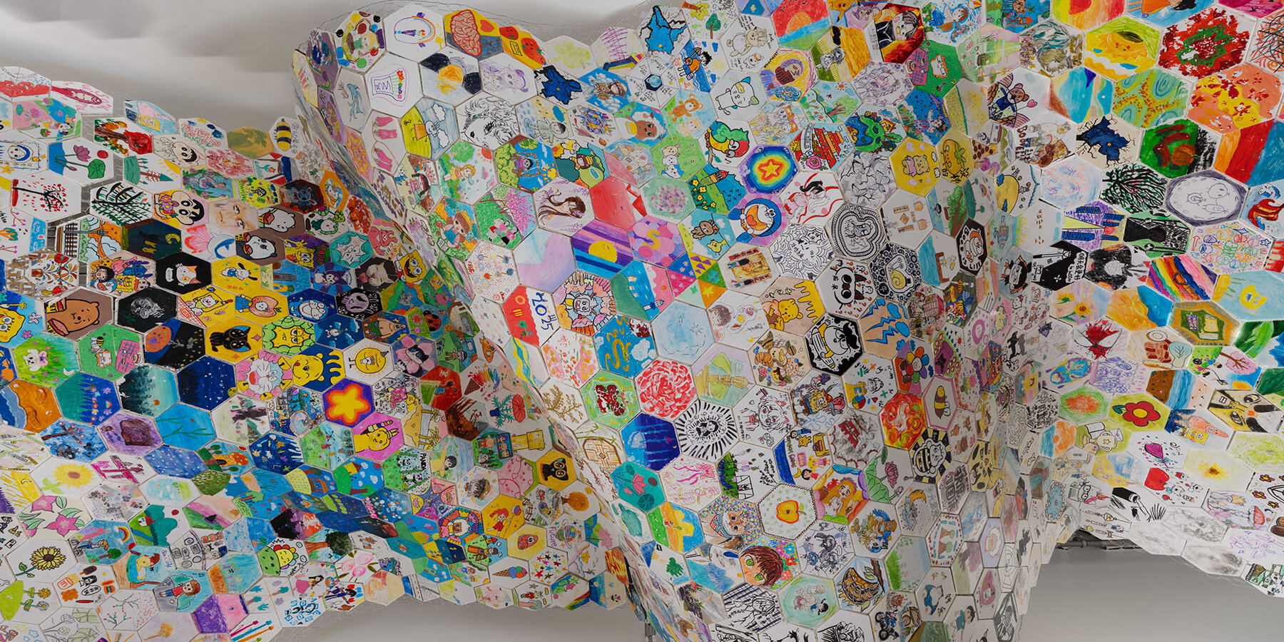 In the exhibition, each hexagon tile is hand-painted by a different contributor, but when placed side by side, they form a field of expression that feels collective rather than fragmented. There’s no single center. Instead, the meaning builds through repetition, placement, and proximity.
