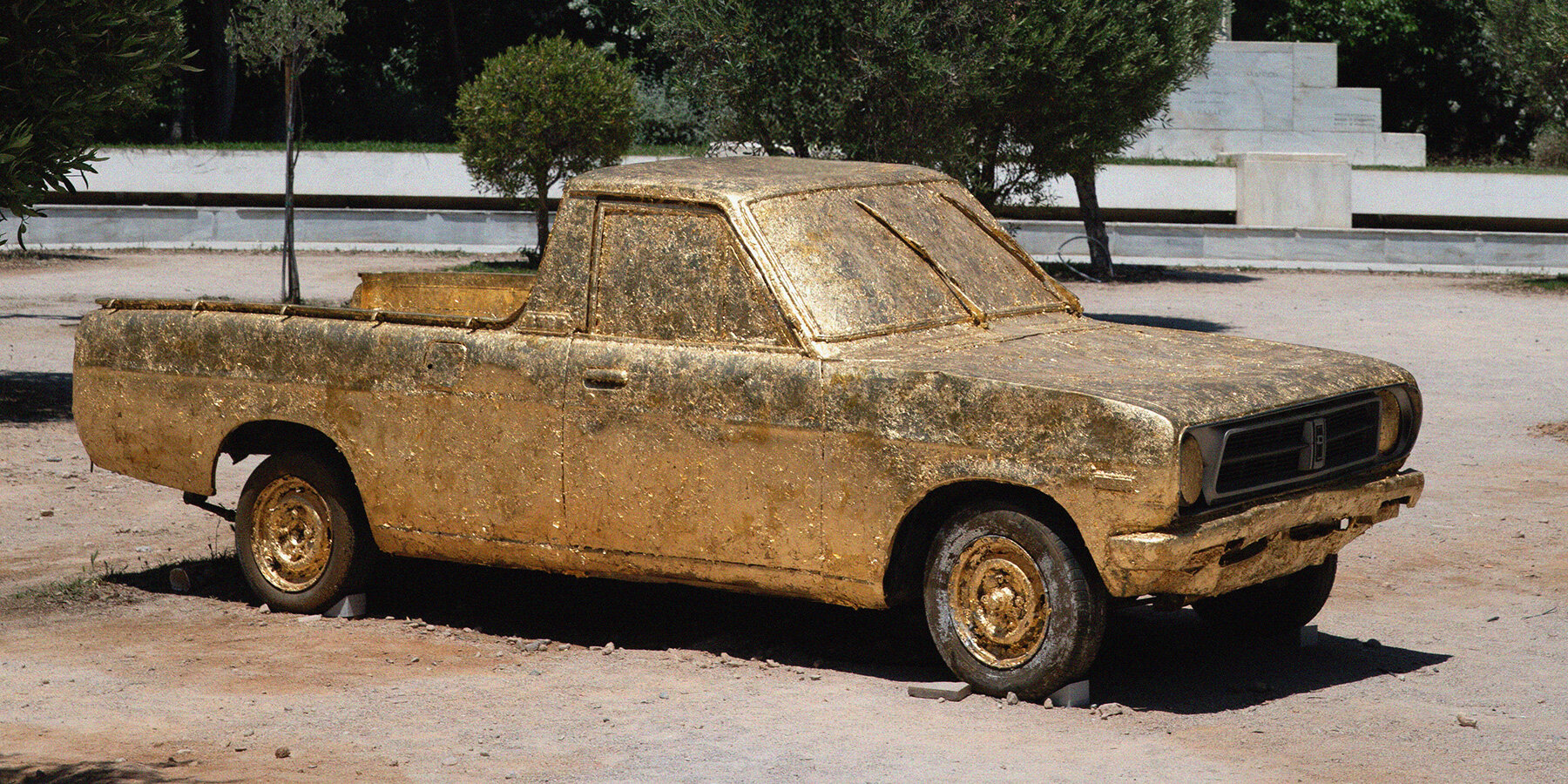 a crystallized truck as meditation on time, divinity, and reflection | image via @bydionysios