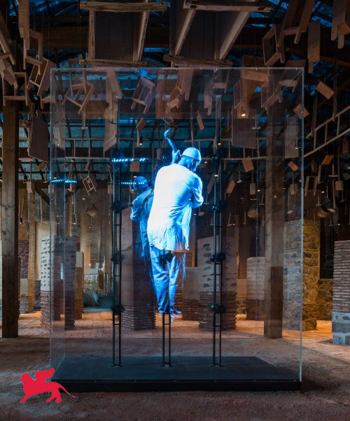 This philosophy grounds the pavilion in a clear critique of contemporary architectural education and practice, which, the duo notes, often privileges conceptual gestures over material literacy. Calls for a broader reflection on how architectural knowledge is produced, as El Ghalili reflects: ‘Too often today, architects don’t know how to build with their hands. They’re trained to be conceptual rather than constructive.’ He frames revisiting these embodied modes of making is as a return to a collaborative, ground-up process that brings designers back into conversation with materials, with place, and with the people who build, as emphasized by the flickering hologram figure at the center of the space, and the traces of the human hand it confronts as carried in each of the columns. Read our full interview with the architects and co-curators below.