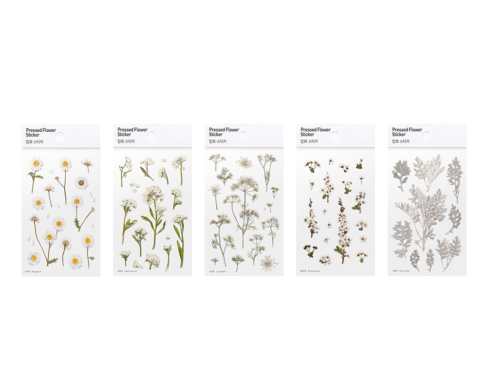 Pressed flower type stickers are made by pressing flowers and leaves. We added minimal design and tried to maximize the natural beauty in itself. This realistically portrayed pressed-flower sticker are naturally merged into wherever we want, making it different place and giving it a new feeling.