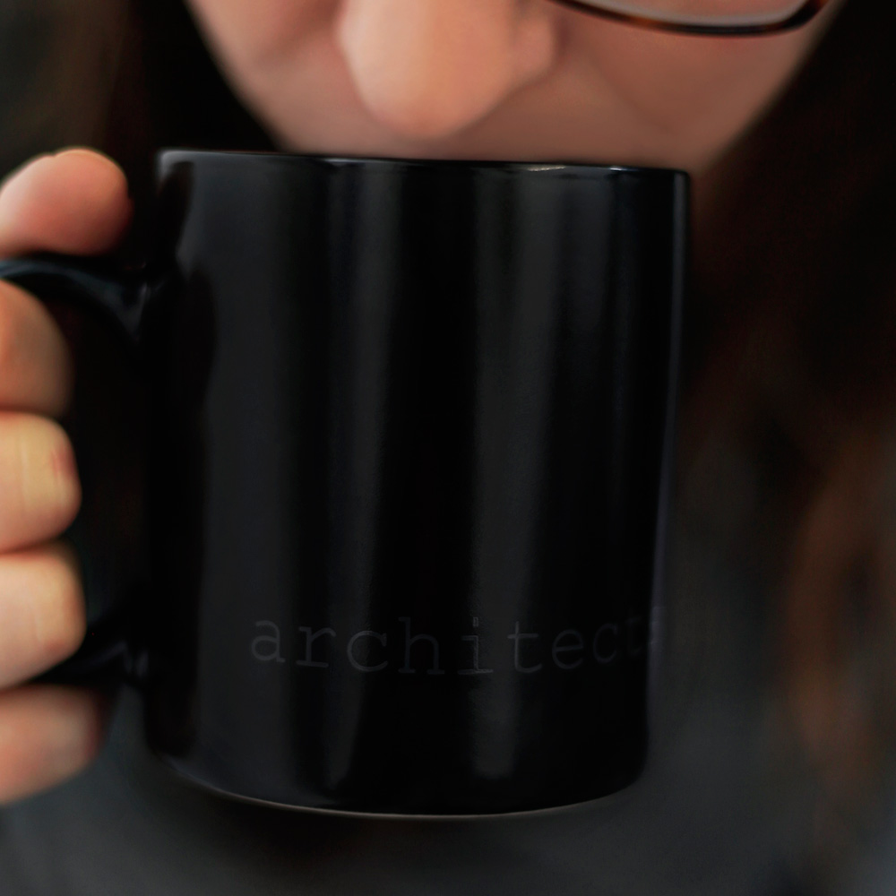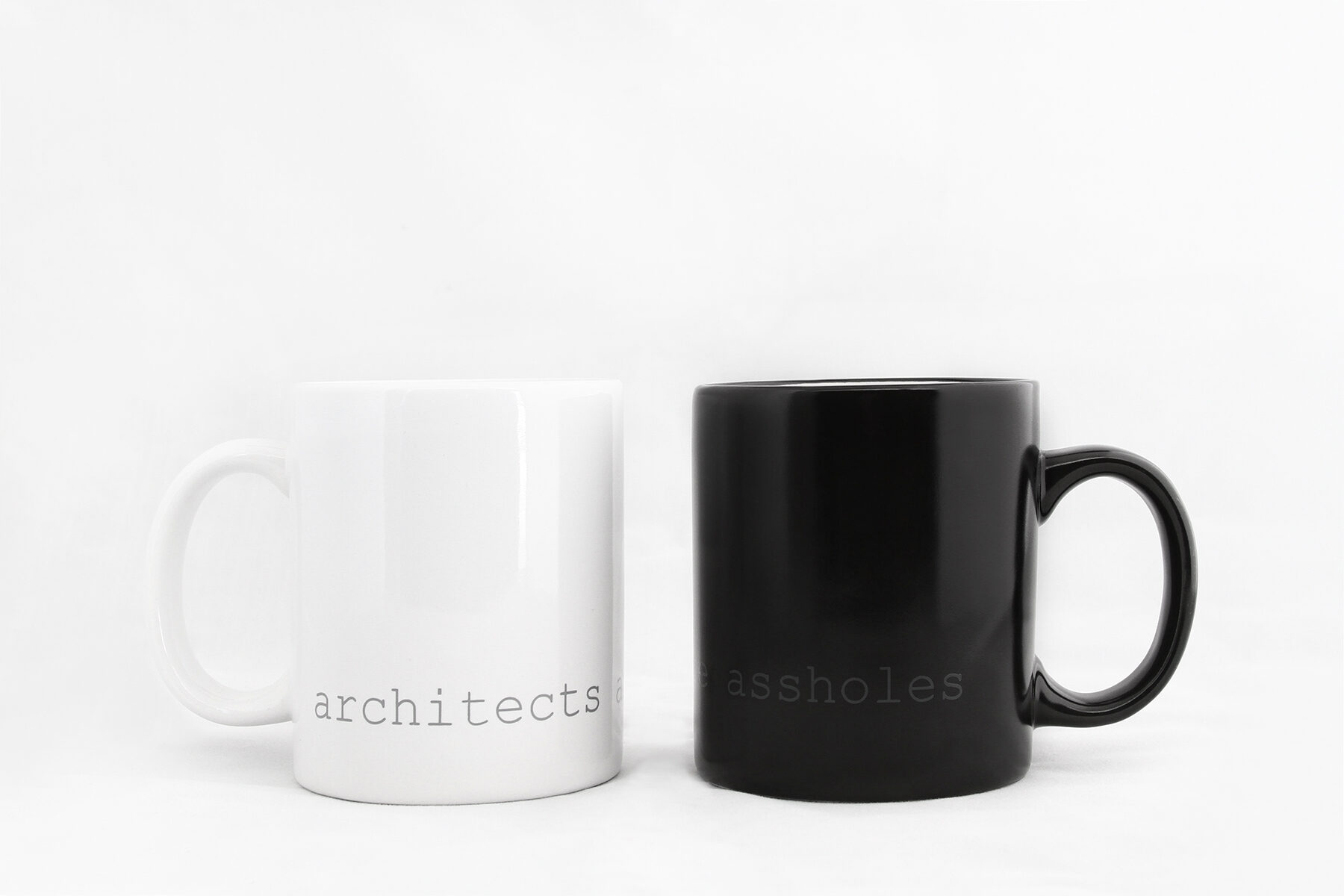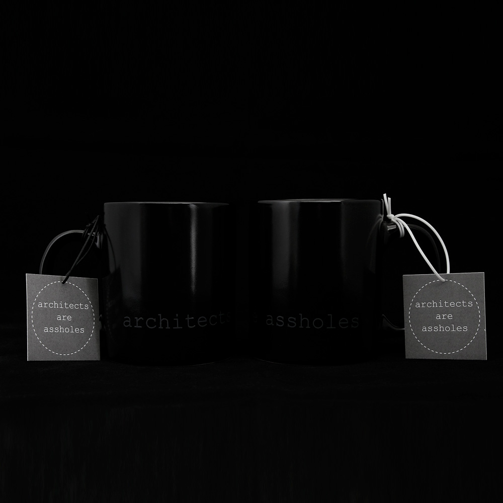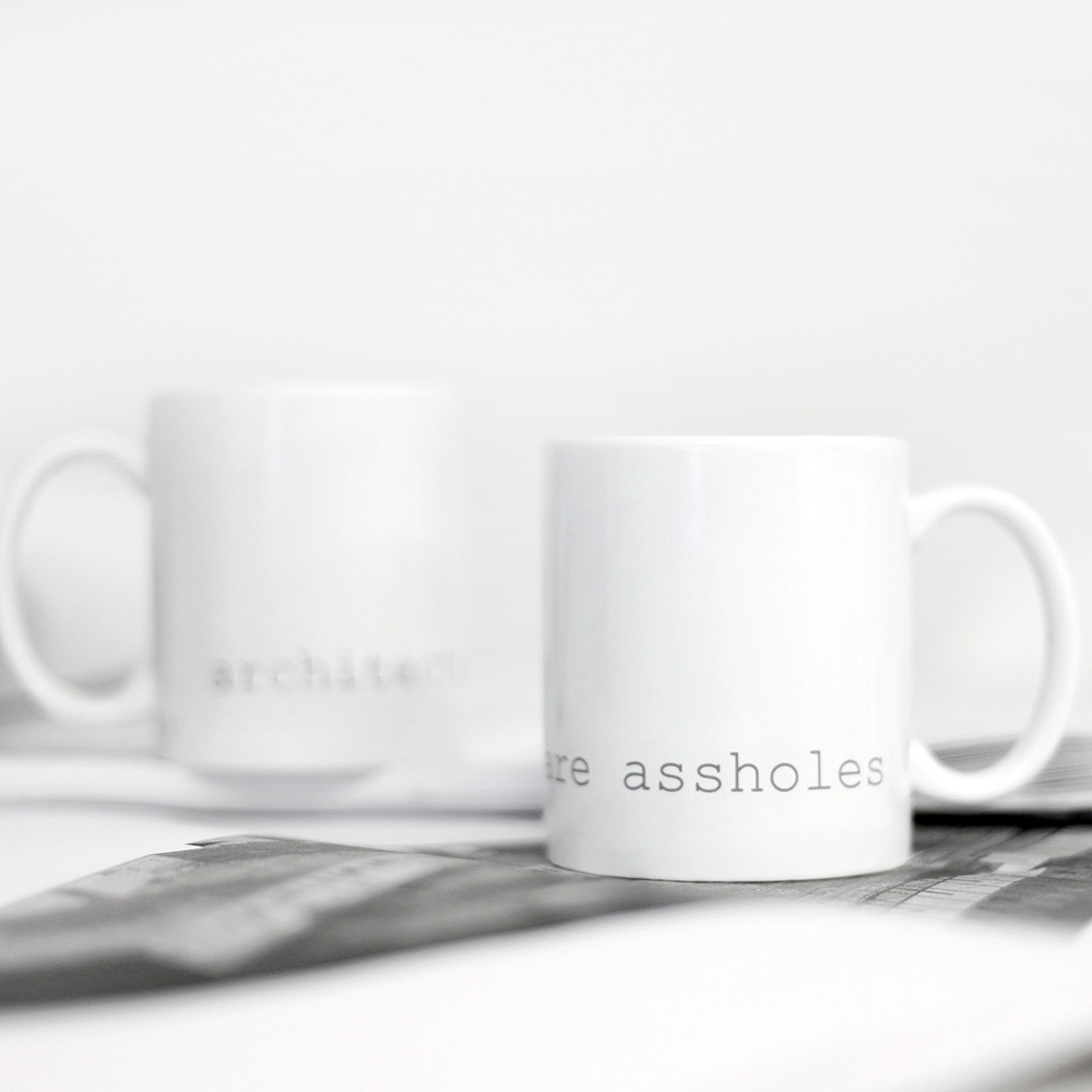 The minimal 11oz mug is a standard classic design that architects and designers can appreciate. Printed using photography’s quintessential 18% grey and courier new font that hearkens back to the mid century modern typewriter, the architects are assholes mug is a cheeky nod to architecture’s provocative personalities. The mugs are available in bright white and matte black with white interior.