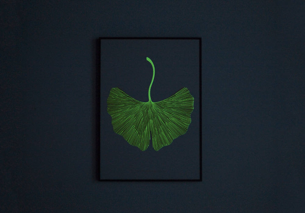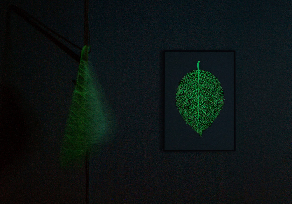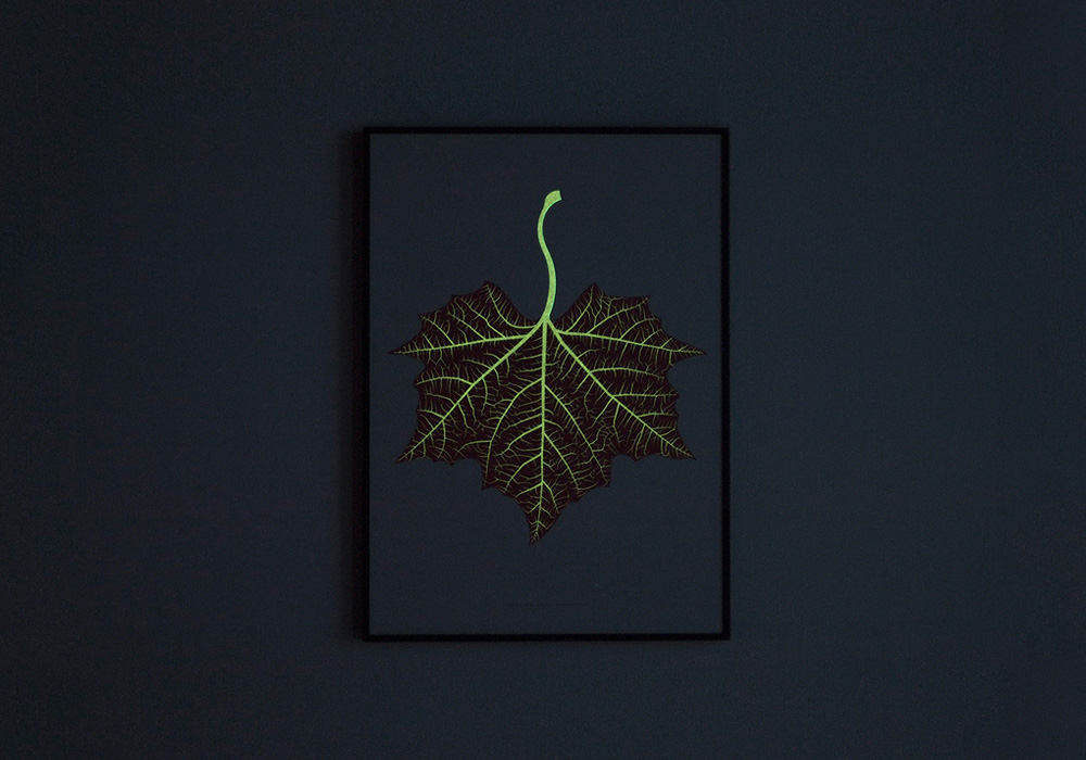 A luminescent pigment is used for expressing intricately detailed leaf veins.